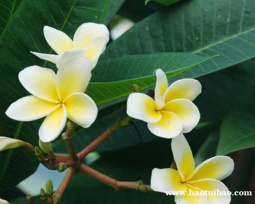 鸡蛋花(学名:Plumeria rubra 'Acutifolia')是夹竹桃科、鸡蛋花属落叶灌木或小乔木。枝条粗壮,带肉质;叶厚纸质;中脉在叶面凹入,侧脉两面扁平。聚伞花序顶生;总花梗三歧,肉质;花梗淡红色;花萼裂片小,卵圆形;花冠外面白色,花冠筒外面及裂片外面左边略带淡红色斑纹,花冠内面黄色;