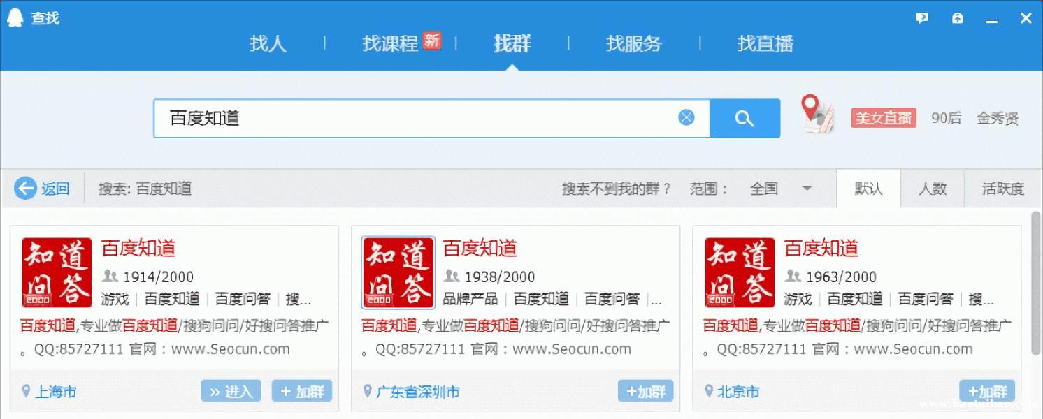 QQ群排除了同行发广告的之外(一般设置群禁言即可排除90%以上同行进入),流量大多都是非常精准,转化效率也是十分的高,最为关键的是,只要你做的群足够的多,那这个流量是相当的大,无论是从流量精准度和流量数量方面,都能比肩百度了,当然了,QQ群的信任度肯定是没百度高的,因此QQ群要想转化千元以上订单的时候,就需要对客户有更多的耐心和销售本领才行。
